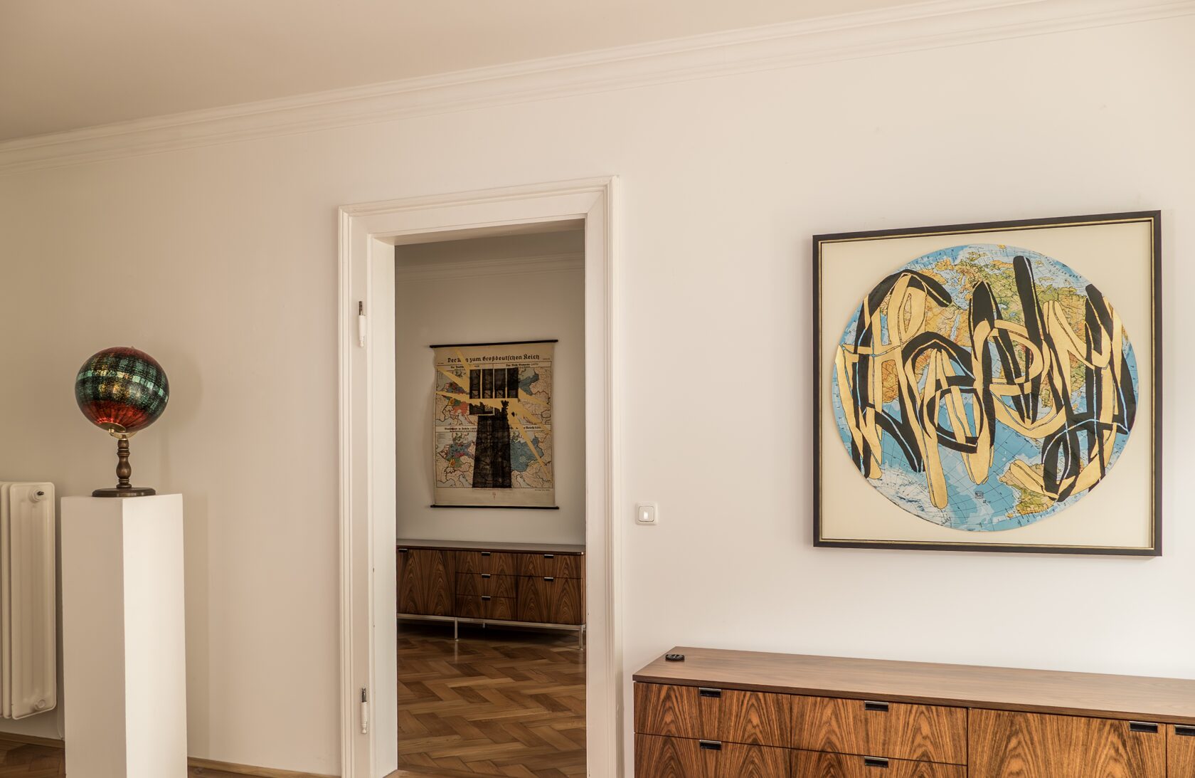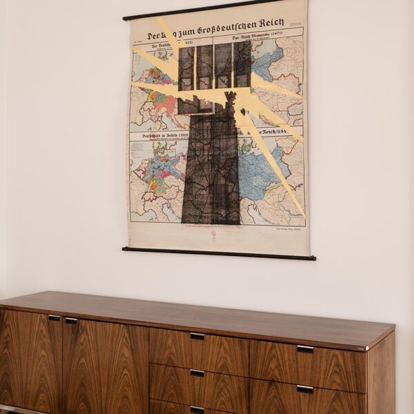 Lightfast Montblanc ink, Chinese ink, Pigmentstift, Gold leaf (Rosenobel 23 ¾ Carat), on schoolmap (1941), 99 x 120 cm; 2024/2025