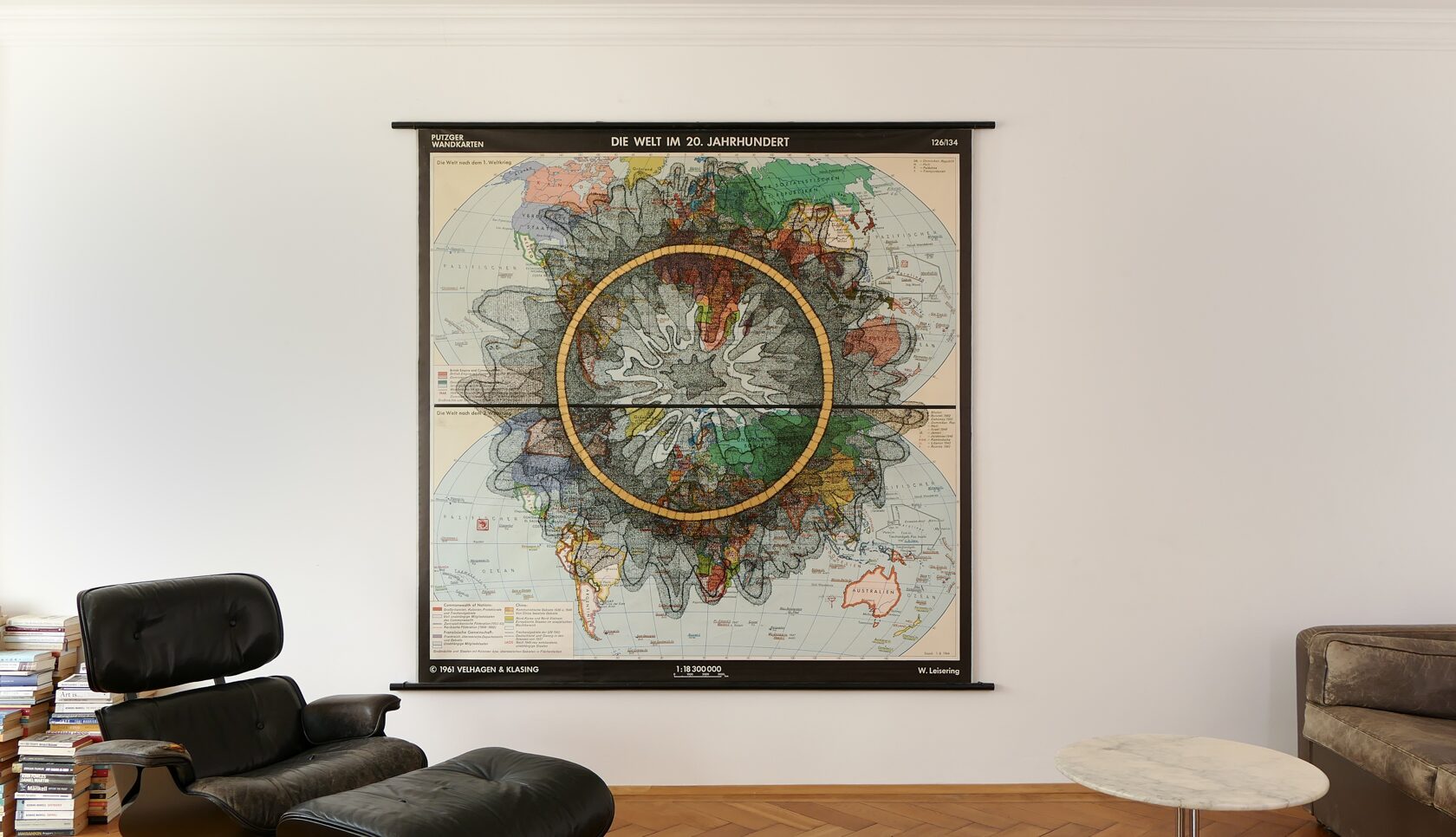 Licht- und dokumentenechte Montblanc Tinte, Blattgold auf Schulwandkarte von 1962; 200 x 200 cm; 2020 - 2021