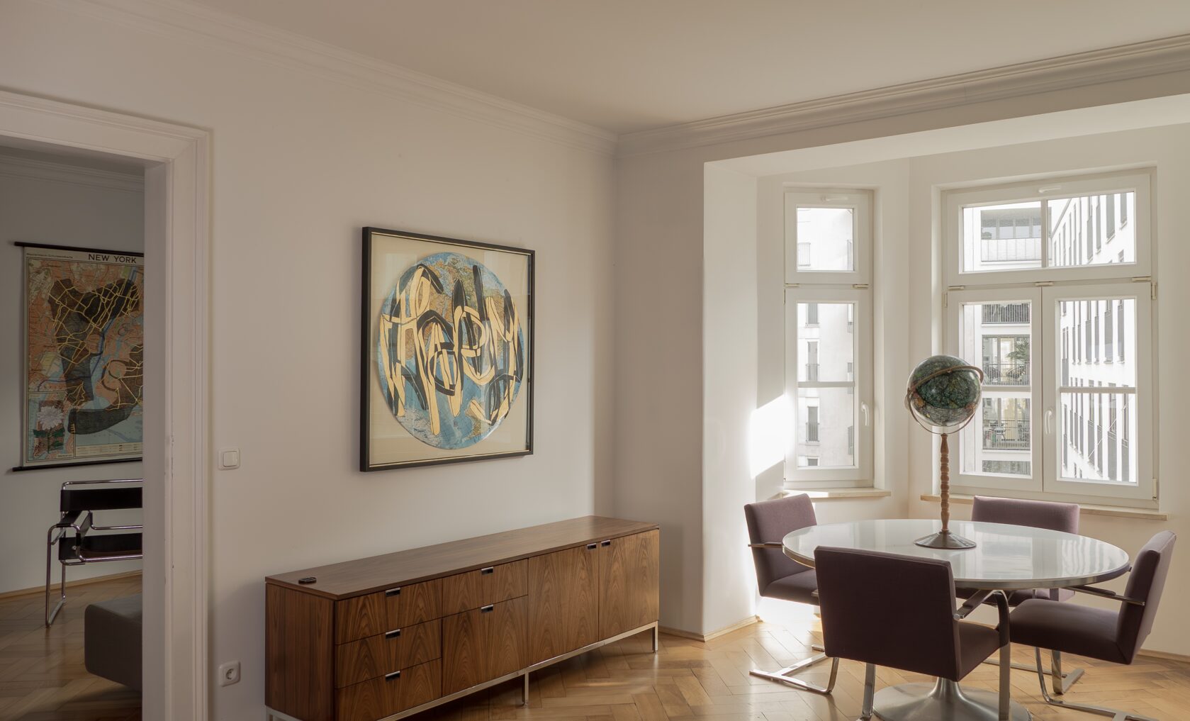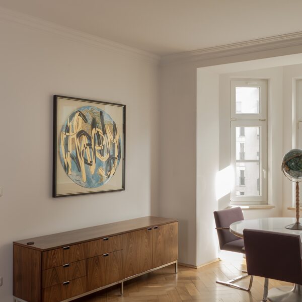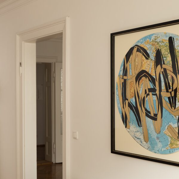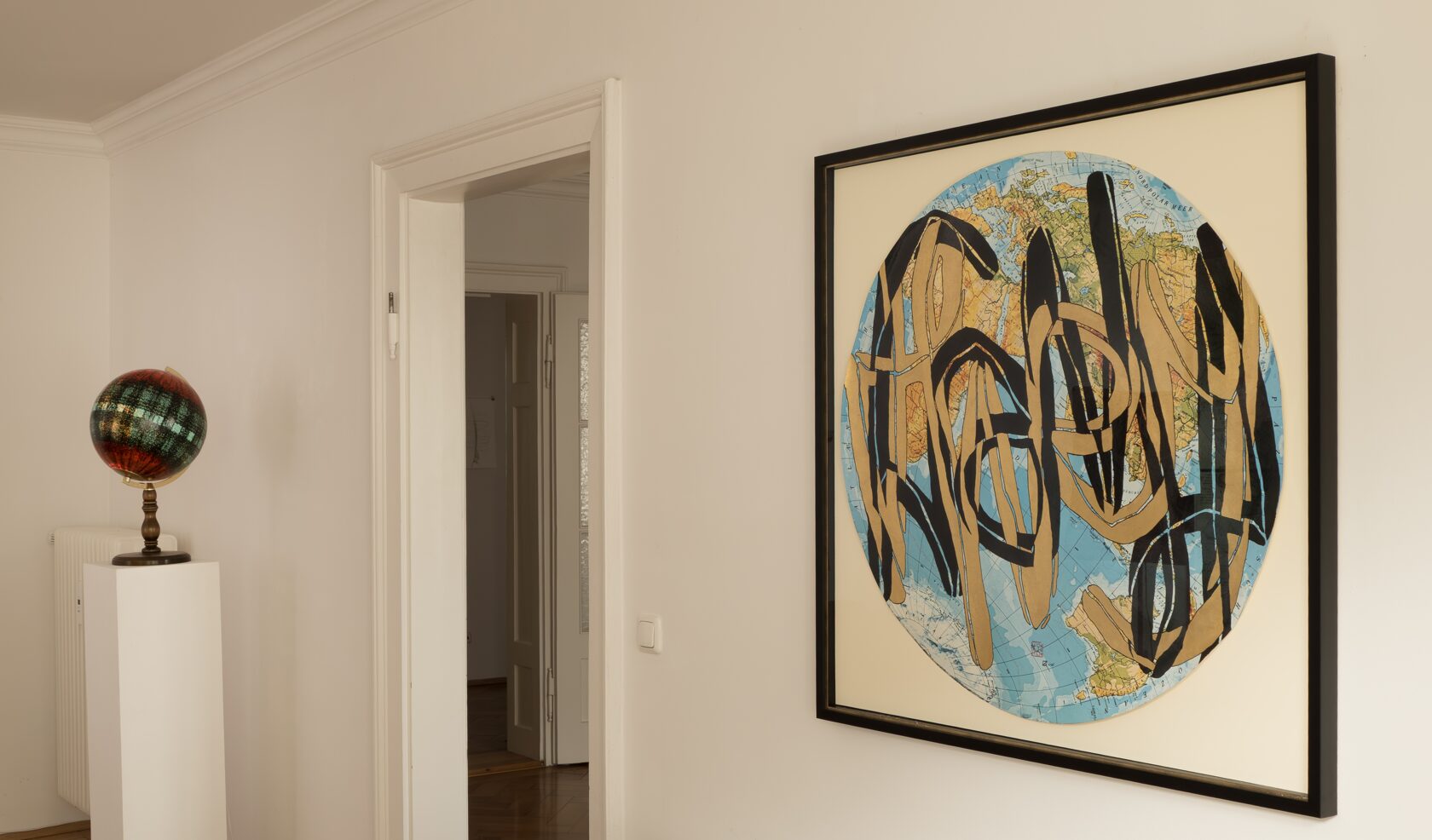 Tusche, Pigmentstift, Blattgold (Rosenobel 23 ¾ Karat), auf Schulwandkarte (1975), ⦰ 90 cm; 2025